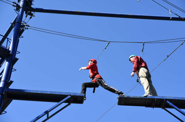 接下来则是考验同学们的勇气和胆量的时候了——“高空断桥”和“高空跨越”项目。 每位同学挑战前,其他同学自发地站成一圈,为挑战者加油鼓劲,承载着队友的鼓励与支持,同学们跨出那勇敢的一步,战胜了心中的胆怯。不轻言放弃,大胆地去做,永远相信在背后有许多人都在为你加油喝彩!