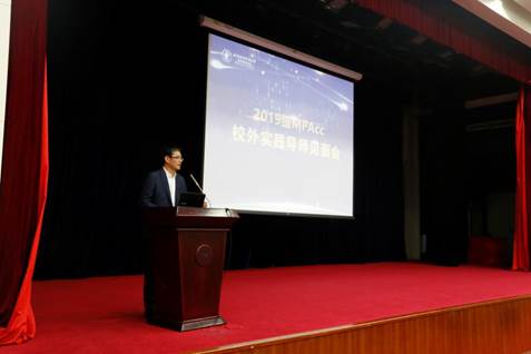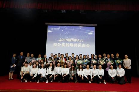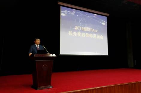 随后,MPAcc中心主任白明副教授介绍了出席见面会的各位校外实践导师,学生代表们向各位导师鞠躬,行拜师礼并敬献了鲜花,对给他们传道授业解惑的导师们表示最崇高的敬意。白明主任对各位导师在“认知专业,抓捕前沿,把关论文”这三方面对MPAcc中心同学们提供的指导表示了衷心的感谢,并对校外导师关于学生的思想政治教育提出了建议。此次见面会邀请了黄光斌总经理和张伟主任作为校外实践导师的代表发表了主题讲话。