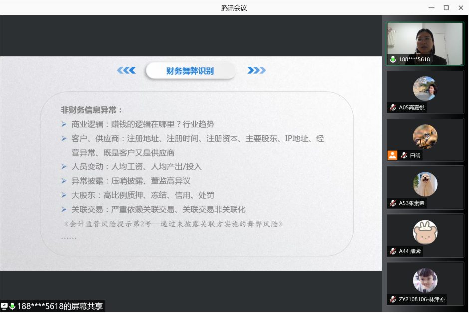 随后,于老师从财务信息异常和非财务信息异常两方面讲述了财务舞弊的识别方法。财务信息异常包含往来款项、存贷双高、资产减值及财务数据匹配项等方面,由于敏感度极高,财务信息异常往往较容易被识别;很多企业经常在非财务信息上大做文章,故于老师以非财务信息异常为重点,结合实际情况讲解了商业逻辑、人员变动、关联交易及客户供应商的具体异常情况及识别方法,加强了同学们对非财务信息异常的认识和关注。