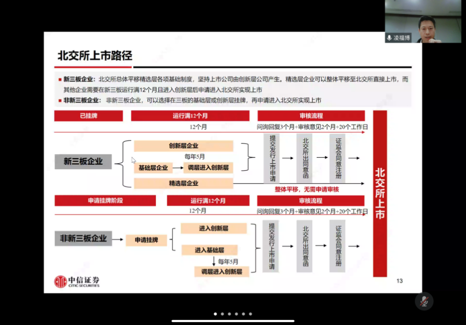 凌老师结合自己的工作经历讲述了证监会持续深化新三板改革的历程和原因,解析了北交所的设立意义及思路,强调北交所是为了创新型中小企业量身打造的交易所。为了让学生们充分了解北交所,凌老师将北交所与创业板、科创板、主板在定位、相关规定、具体内容、股票交易等方面进行比较,具体地分析了北交所的上市路径。